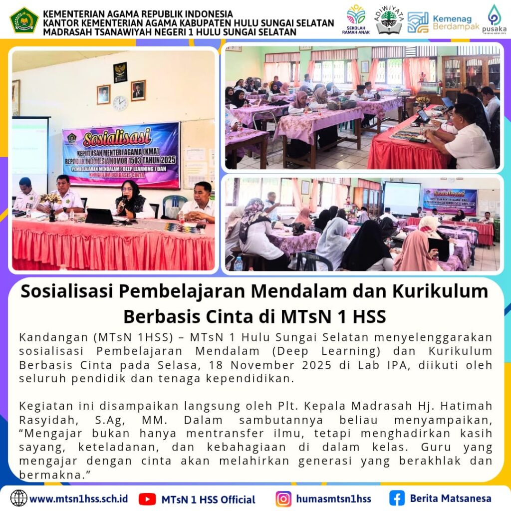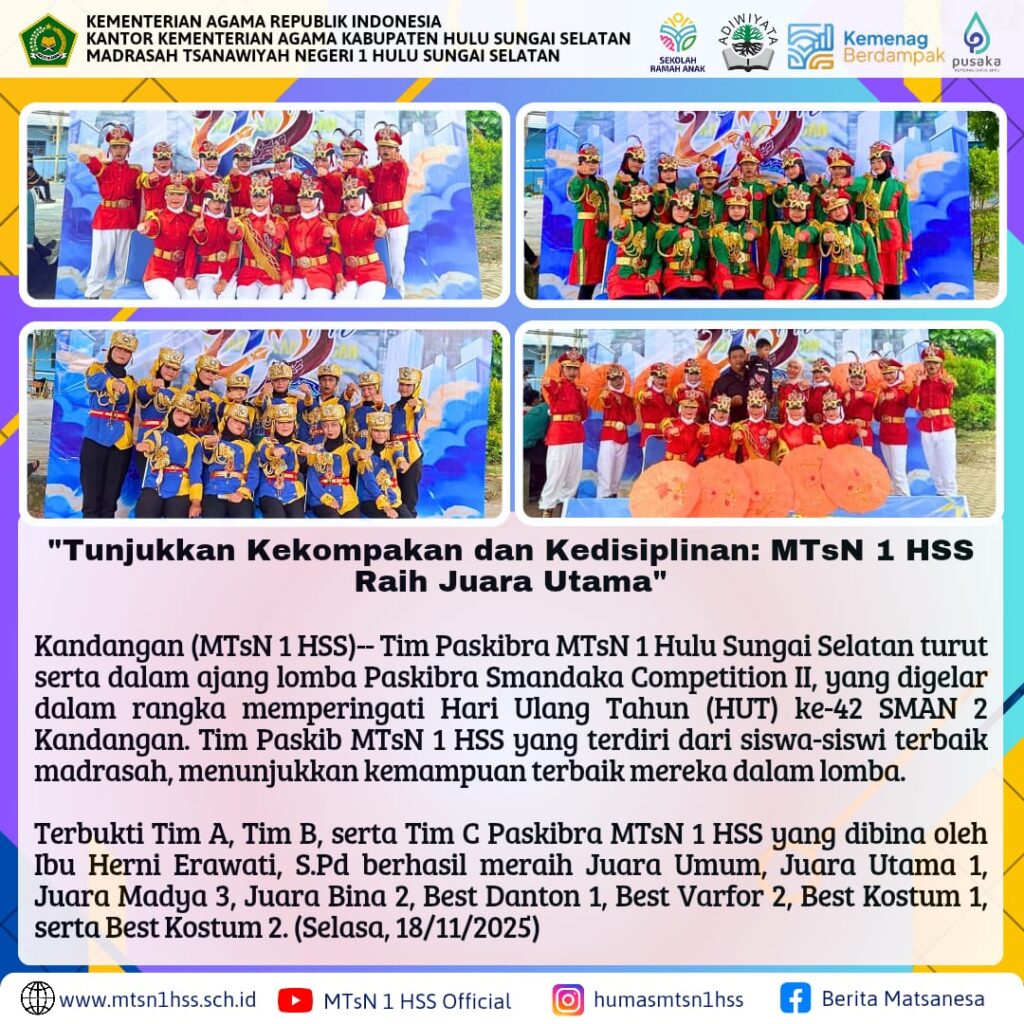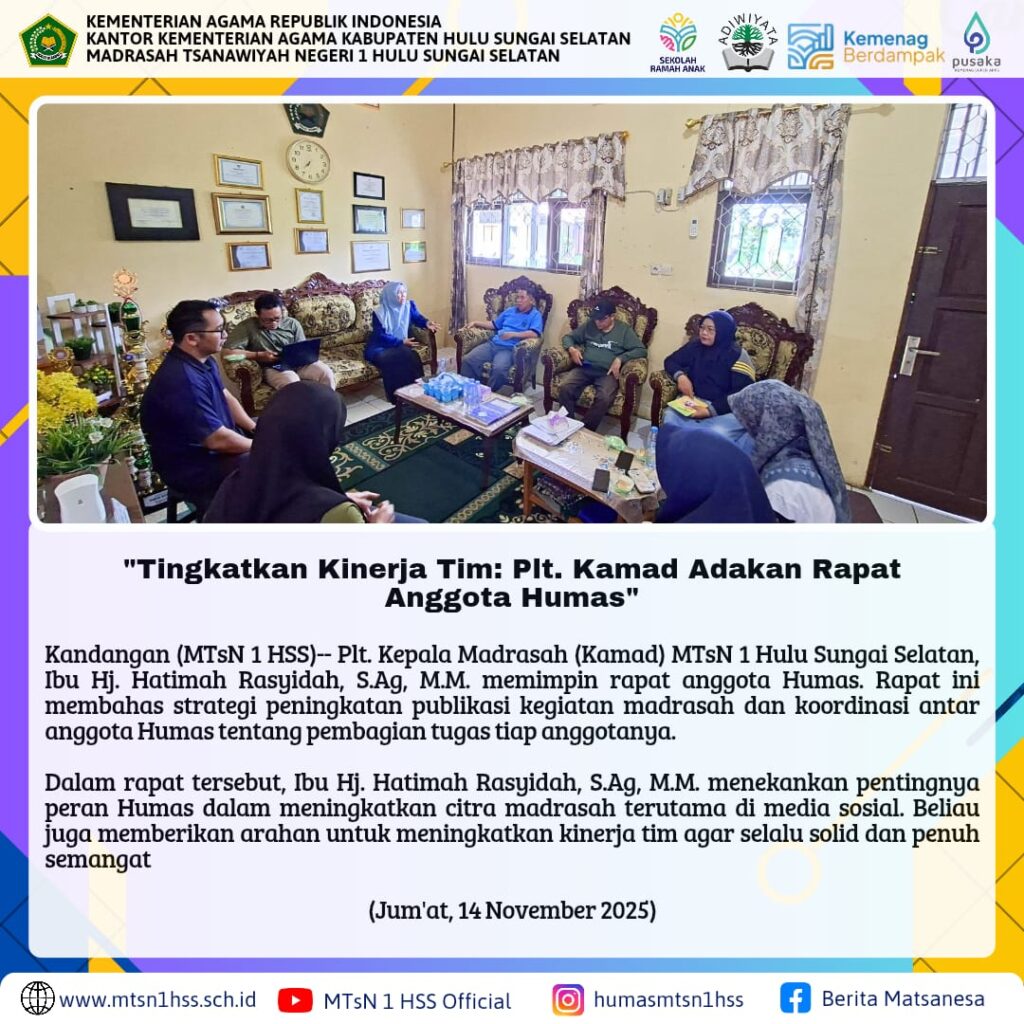Kandangan( MTsN 1 HSS) – Humas MTsN 1 HSS melaksanakan Rapat Evaluasi Tim Humas yang bertempat di Ruang Kepala Madrasah. Rapat ini digelar untuk memperkuat koordinasi, meningkatkan kualitas publikasi, serta…