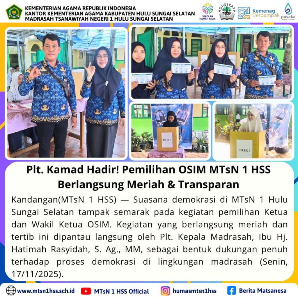 Kandangan (MTsN 1 HSS) — Suasana demokrasi di MTsN 1 Hulu Sungai Selatan tampak semarak pada kegiatan pemilihan Ketua dan Wakil Ketua OSIM. Kegiatan yang berlangsung meriah dan tertib ini…